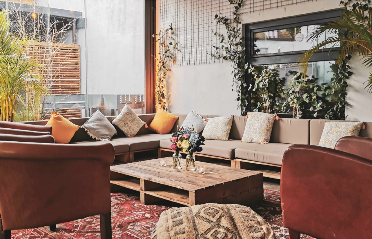 Gedempte en indirecte verlichting, vintage meubilair, designobjecten van gerecycled hout en weelderige begroeiing... De salon nodigt uit tot ontspanning en conversatie.